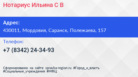 Нотариус Ильина С.В. по адресу 430011, Мордовия, Саранск, Полежаева, 157 в дальнейшем Организация, размещена в следующих категориях: