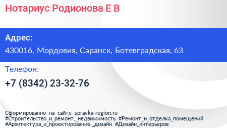 Нотариус Родионова Е.В. по адресу 430016, Мордовия, Саранск, Ботевградская, 63 в дальнейшем Организация, размещена в следующих категориях:
