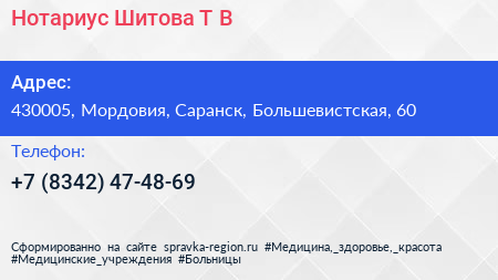 Нотариус Шитова Т.В. по адресу 430005, Мордовия, Саранск, Большевистская, 60 в дальнейшем Организация, размещена в следующих категориях: