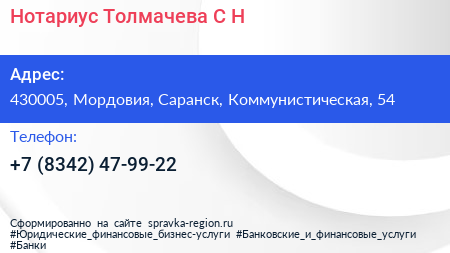Нотариус Толмачева С.Н. по адресу 430005, Мордовия, Саранск, Коммунистическая, 54 в дальнейшем Организация, размещена в следующих категориях: