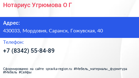 Нотариус Угрюмова О.Г. по адресу 430033, Мордовия, Саранск, Гожувская, 40 в дальнейшем Организация, размещена в следующих категориях: