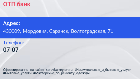 ОТП банк по адресу 430009, Мордовия, Саранск, Волгоградская, 71 в дальнейшем Организация, размещена в следующих категориях: