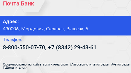 Почта Банк по адресу 430006, Мордовия, Саранск, Вакеева, 5 в дальнейшем Организация, размещена в следующих категориях: