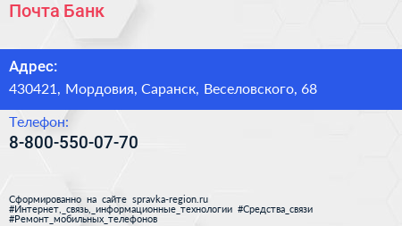 Почта Банк по адресу 430421, Мордовия, Саранск, Веселовского, 68 в дальнейшем Организация, размещена в следующих категориях: