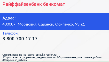 Райффайзенбанк, банкомат по адресу 430007, Мордовия, Саранск, Осипенко, 93 к1 в дальнейшем Организация, размещена в следующих категориях: