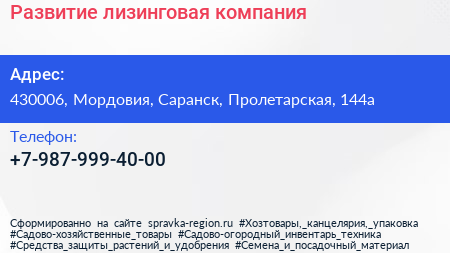 Развитие, лизинговая компания по адресу 430006, Мордовия, Саранск, Пролетарская, 144а в дальнейшем Организация, размещена в следующих категориях:
