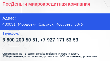 РосДеньги, микрокредитная компания по адресу 430031, Мордовия, Саранск, Косарева, 50/6 в дальнейшем Организация, размещена в следующих категориях: