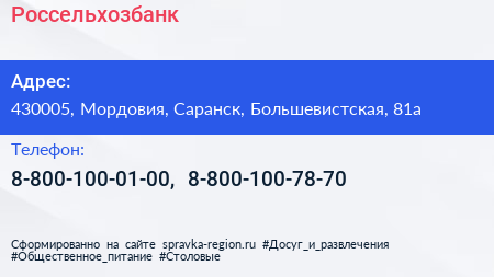 Россельхозбанк по адресу 430005, Мордовия, Саранск, Большевистская, 81а в дальнейшем Организация, размещена в следующих категориях: