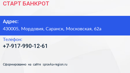 СТАРТ БАНКРОТ по адресу 430005, Мордовия, Саранск, Московская, 62а в дальнейшем Организация, размещена в следующих категориях: