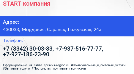 START, компания по адресу 430033, Мордовия, Саранск, Гожувская, 24а в дальнейшем Организация, размещена в следующих категориях: