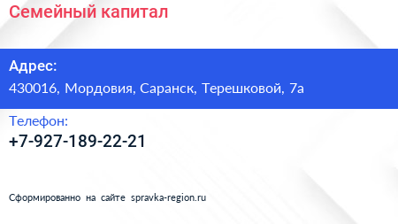 Семейный капитал по адресу 430016, Мордовия, Саранск, Терешковой, 7а в дальнейшем Организация, размещена в следующих категориях: