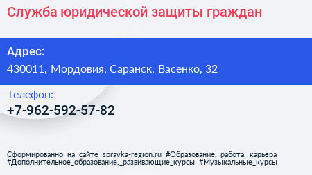 Служба юридической защиты граждан по адресу 430011, Мордовия, Саранск, Васенко, 32 в дальнейшем Организация, размещена в следующих категориях: