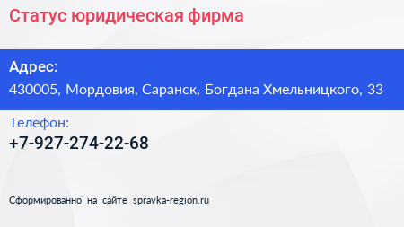 Статус, юридическая фирма по адресу 430005, Мордовия, Саранск, Богдана Хмельницкого, 33 в дальнейшем Организация, размещена в следующих категориях: