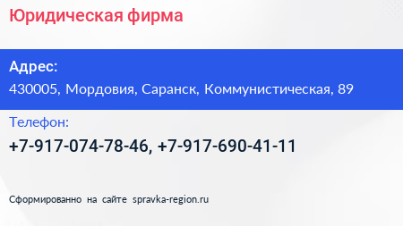Юридическая фирма по адресу 430005, Мордовия, Саранск, Коммунистическая, 89 в дальнейшем Организация, размещена в следующих категориях: