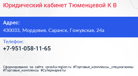 Юридический кабинет Тюменцевой К.В. по адресу 430033, Мордовия, Саранск, Гожувская, 24а в дальнейшем Организация, размещена в следующих категориях: