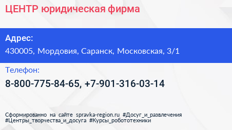 ЦЕНТР, юридическая фирма по адресу 430005, Мордовия, Саранск, Московская, 3/1 в дальнейшем Организация, размещена в следующих категориях: