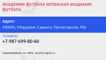 Академия футбола, испанская академия футбола по адресу 430005, Мордовия, Саранск, Пролетарская, 92а в дальнейшем Организация, размещена в следующих категориях: