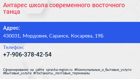 Антарес, школа современного восточного танца по адресу 430031, Мордовия, Саранск, Косарева, 19Б в дальнейшем Организация, размещена в следующих категориях: