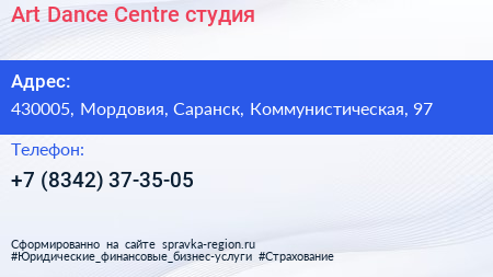 Art Dance Centre, студия по адресу 430005, Мордовия, Саранск, Коммунистическая, 97 в дальнейшем Организация, размещена в следующих категориях: