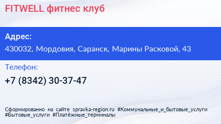 FITWELL, фитнес-клуб по адресу 430032, Мордовия, Саранск, Марины Расковой, 43 в дальнейшем Организация, размещена в следующих категориях: