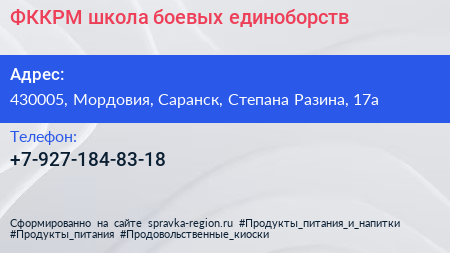 ФККРМ, школа боевых единоборств по адресу 430005, Мордовия, Саранск, Степана Разина, 17а в дальнейшем Организация, размещена в следующих категориях: