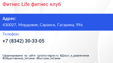 Фитнес Life, фитнес-клуб по адресу 430027, Мордовия, Саранск, Гагарина, 99а в дальнейшем Организация, размещена в следующих категориях: