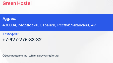 Green Hostel по адресу 430004, Мордовия, Саранск, Республиканская, 49 в дальнейшем Организация, размещена в следующих категориях: