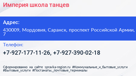 Империя, школа танцев по адресу 430009, Мордовия, Саранск, проспект Российской Армии, 7 в дальнейшем Организация, размещена в следующих категориях: