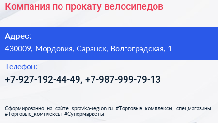 Компания по прокату велосипедов по адресу 430009, Мордовия, Саранск, Волгоградская, 1 в дальнейшем Организация, размещена в следующих категориях:
