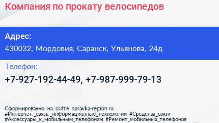 Компания по прокату велосипедов по адресу 430032, Мордовия, Саранск, Ульянова, 24д в дальнейшем Организация, размещена в следующих категориях: