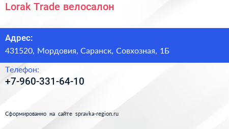 Lorak Trade, велосалон по адресу 431520, Мордовия, Саранск, Совхозная, 1Б в дальнейшем Организация, размещена в следующих категориях: