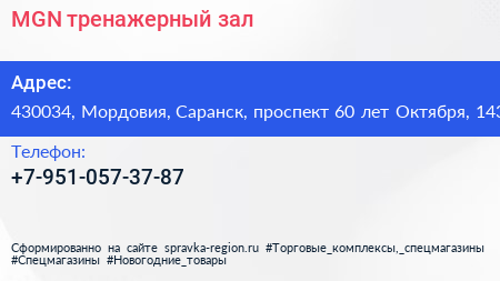 MGN, тренажерный зал по адресу 430034, Мордовия, Саранск, проспект 60 лет Октября, 143 в дальнейшем Организация, размещена в следующих категориях: