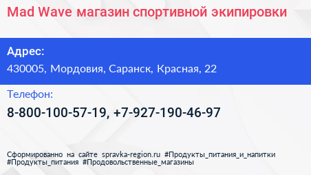 Mad Wave, магазин спортивной экипировки по адресу 430005, Мордовия, Саранск, Красная, 22 в дальнейшем Организация, размещена в следующих категориях: