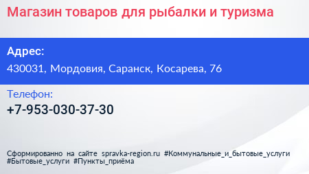 Магазин товаров для рыбалки и туризма по адресу 430031, Мордовия, Саранск, Косарева, 76 в дальнейшем Организация, размещена в следующих категориях: