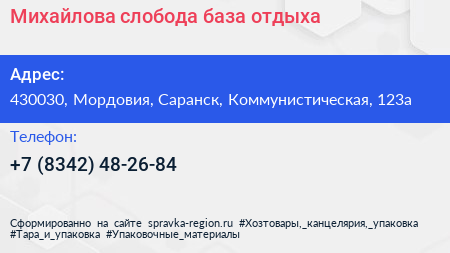 Михайлова слобода, база отдыха по адресу 430030, Мордовия, Саранск, Коммунистическая, 123а в дальнейшем Организация, размещена в следующих категориях: