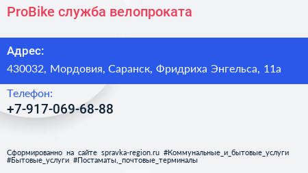 ProBike, cлужба велопроката по адресу 430032, Мордовия, Саранск, Фридриха Энгельса, 11а в дальнейшем Организация, размещена в следующих категориях:
