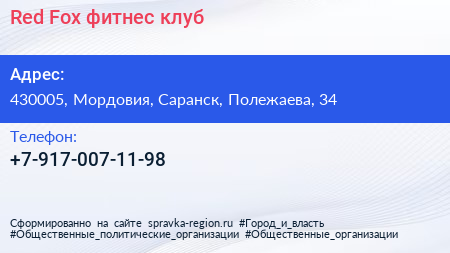 Red Fox, фитнес-клуб по адресу 430005, Мордовия, Саранск, Полежаева, 34 в дальнейшем Организация, размещена в следующих категориях: