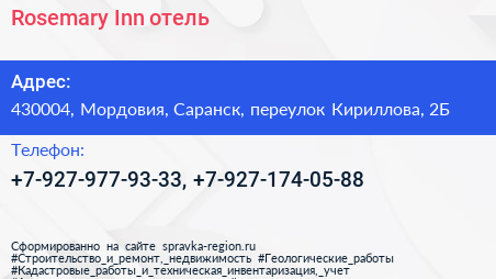 Rosemary Inn, отель по адресу 430004, Мордовия, Саранск, переулок Кириллова, 2Б в дальнейшем Организация, размещена в следующих категориях: