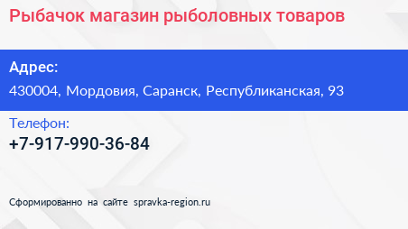 Рыбачок, магазин рыболовных товаров по адресу 430004, Мордовия, Саранск, Республиканская, 93 в дальнейшем Организация, размещена в следующих категориях: