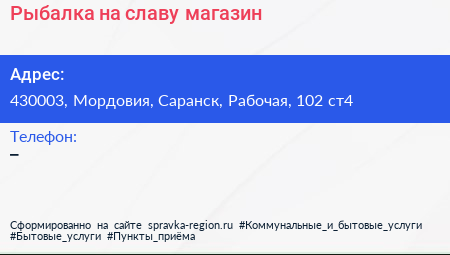 Рыбалка на славу, магазин по адресу 430003, Мордовия, Саранск, Рабочая, 102 ст4 в дальнейшем Организация, размещена в следующих категориях: