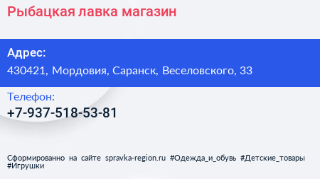 Рыбацкая лавка, магазин по адресу 430421, Мордовия, Саранск, Веселовского, 33 в дальнейшем Организация, размещена в следующих категориях: