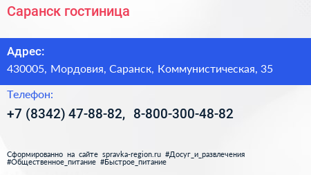 Саранск, гостиница по адресу 430005, Мордовия, Саранск, Коммунистическая, 35 в дальнейшем Организация, размещена в следующих категориях: