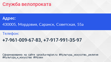 Служба велопроката по адресу 430005, Мордовия, Саранск, Советская, 55а в дальнейшем Организация, размещена в следующих категориях: