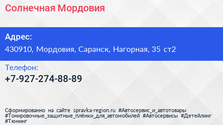 Солнечная Мордовия по адресу 430910, Мордовия, Саранск, Нагорная, 35 ст2 в дальнейшем Организация, размещена в следующих категориях: