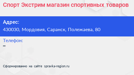 Спорт Экстрим, магазин спортивных товаров по адресу 430030, Мордовия, Саранск, Полежаева, 80 в дальнейшем Организация, размещена в следующих категориях: