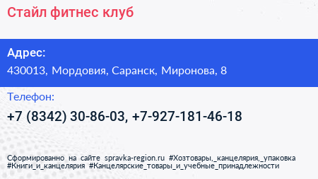 Стайл, фитнес-клуб по адресу 430013, Мордовия, Саранск, Миронова, 8 в дальнейшем Организация, размещена в следующих категориях: