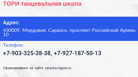 ТОРИ, танцевальная школа по адресу 430009, Мордовия, Саранск, проспект Российской Армии, 10 в дальнейшем Организация, размещена в следующих категориях: