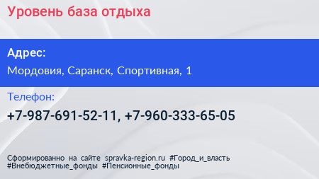 Уровень, база отдыха по адресу Мордовия, Саранск, Спортивная, 1 в дальнейшем Организация, размещена в следующих категориях: