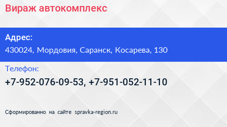 Вираж, автокомплекс по адресу 430024, Мордовия, Саранск, Косарева, 130 в дальнейшем Организация, размещена в следующих категориях: