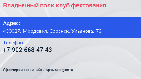 Владычный полк, клуб фехтования по адресу 430027, Мордовия, Саранск, Ульянова, 73 в дальнейшем Организация, размещена в следующих категориях: